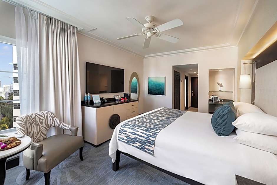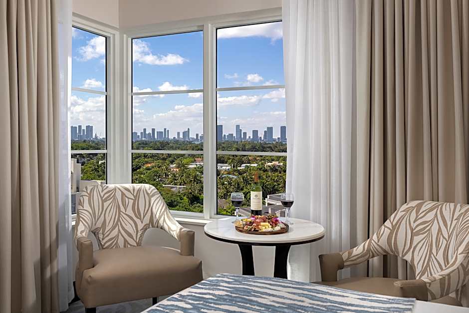 This room features a 48-inch flat-screen TV as well as views of the Miami skyline.
